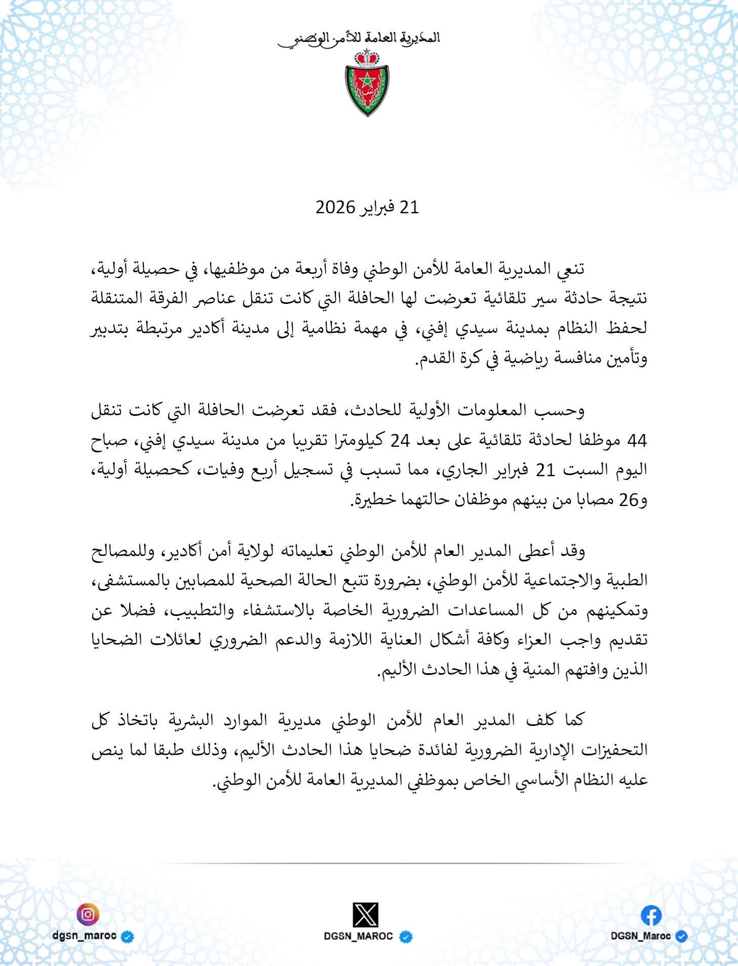 نعت المديرية العامة للأمن الوطني أربعة من موظفيها، وفق حصيلة أولية، إثر حادثة سير تعرضت لها الحافلة التي كانت تقل عناصر الفرقة المتنقلة لحفظ النظام بمدينة سيدي إفني في مهمة نظامية نحو أكادير لتأمين منافسة رياضية في كرة القدم.