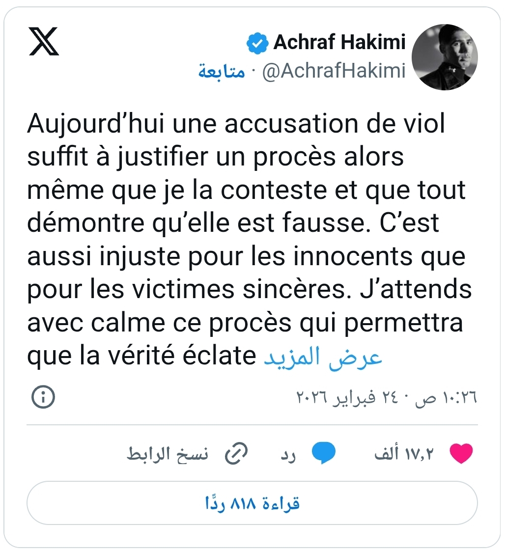 وفي تعليق له عبر منصة “إكس”، اعتبر حكيمي أن توجيه تهمة اغتصاب أصبح كافياً لإحالة أي شخص إلى المحاكمة، حتى في حال الطعن فيها، مؤكداً أن المعطيات المتوفرة، بحسب قوله، تثبت بطلان الاتهامات.